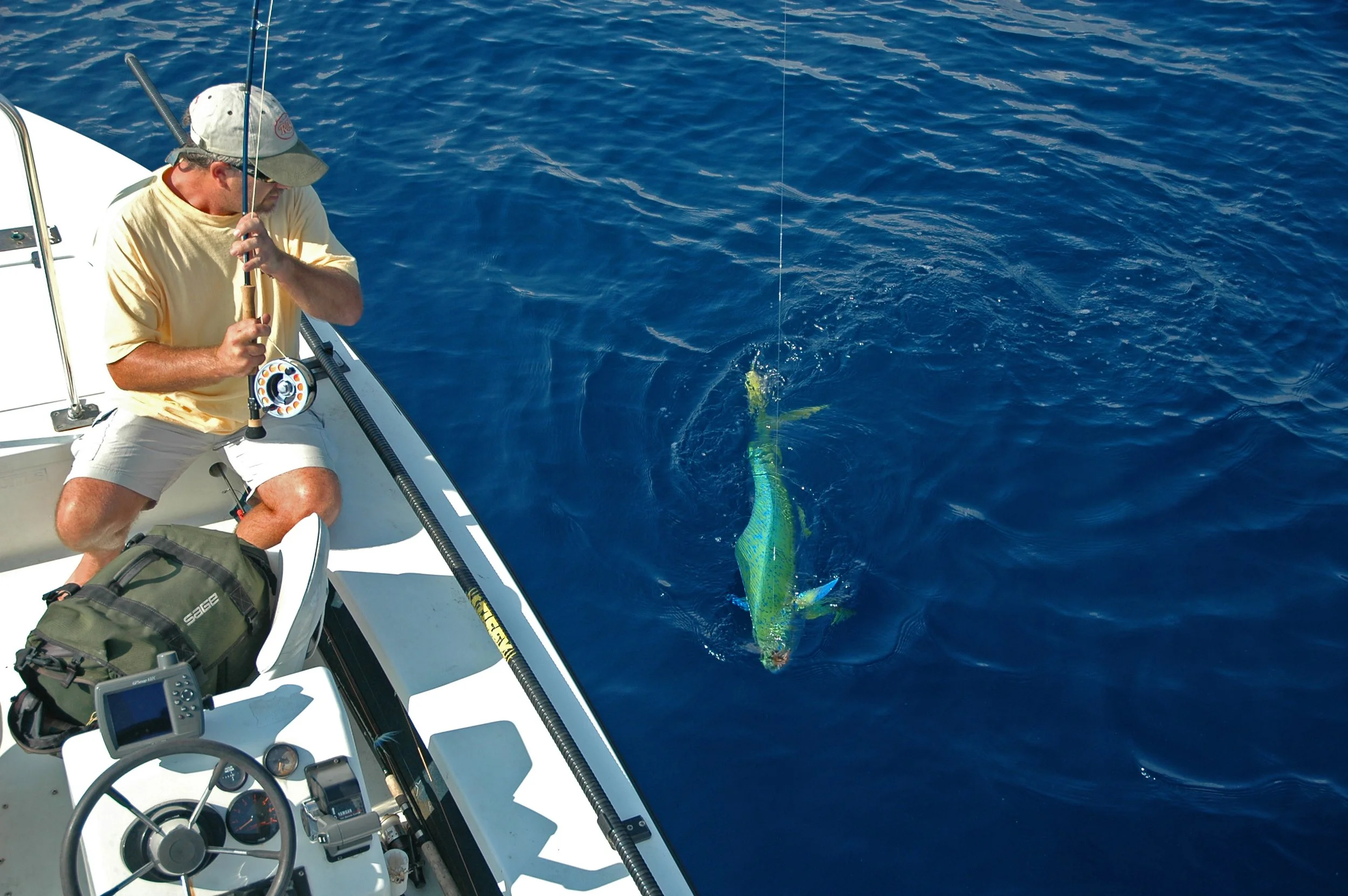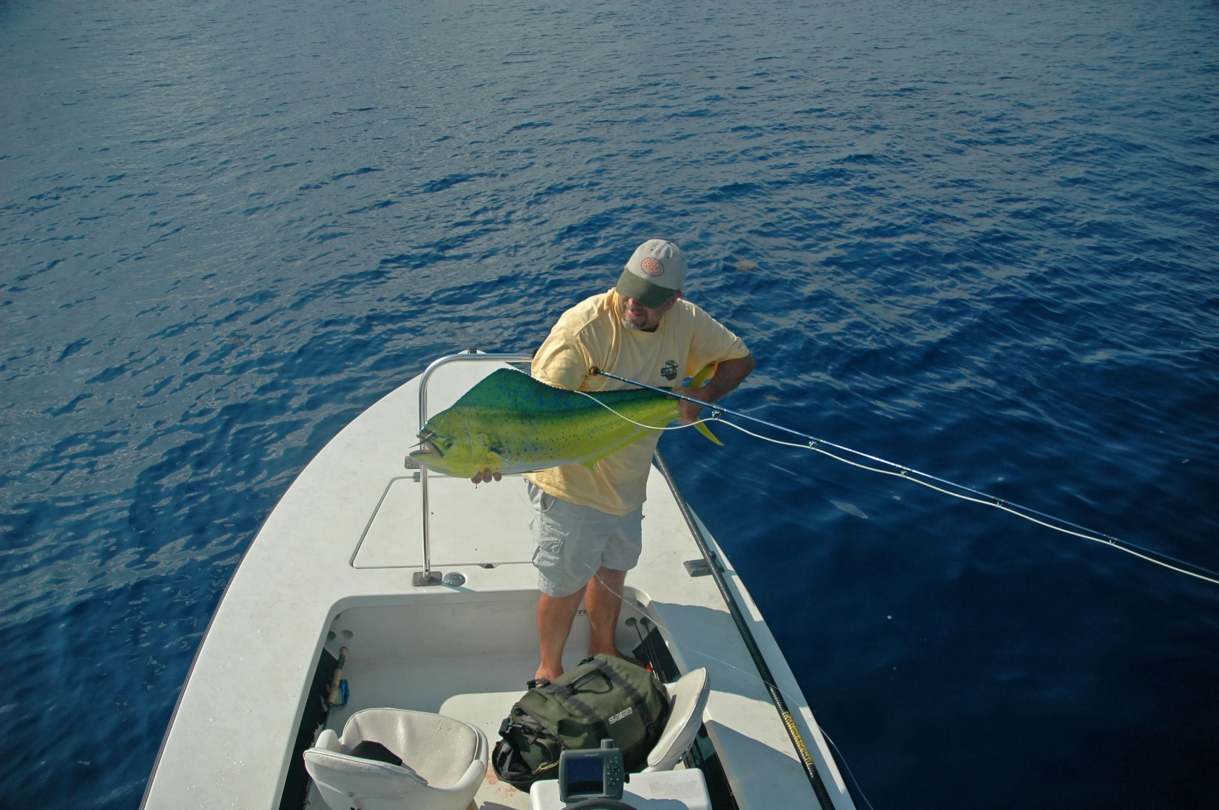 Instead of the whale shark we had come across singles and pairs of fining dorado, dolphin fish, mahi mahi, whatever you want to call them that were swimming leisurely through very small, scattered patches of sargasso weed. The first pair we saw came within casting range but with the sea so calm and water so clear it became very obvious they were exceptionally spooky. Some had colorings much like a wide zebra strip which we assumed is an adopted ‘ pattern ‘to enable the fish to better blend in with the weed. The dilemma we had now however was that the only way we could maneuver into position was by the engine. The 20 foot push pole was just not going to cut it in 1500 feet of water. A few more of the fish had come close enough to cast to and we did hook one which created enough disturbance to make some others join the fun so a double hook up was achieved very quickly. However those others that would follow the hooked fish would lose interest and swim away. We landed and released both the fish and found ourselves right back at square one. We could see fish every so often cruising along, the very tips of their tails showing above the surface or we could see the gold and green/blue coloring but if we started the motor they would either sound or when we got to them they were disturbed enough not to eat our offerings. Oh for a bag of pilchards we thought !! It was frustrating to accept this as they were so near yet so far and it’s not every day one can catch ‘ tailing ‘ dolphin from a skiff. They would not travel far for the fly and much like some tarpon they had to be fed. Normally dolphin are very ferocious feeders and you only need get the fly in the water somewhere and strip it fast and they will attack like green, gold and blue torpedos, especially if one is already hooked to one or they are ‘ encouraged ‘ with chum/chunk. Neat to watch and experience like that but a very straight forward proposition none the less. What was happening in front of us however was very much a different scenario and was making for very interesting fishing. The purist in me was now relishing the challenge.